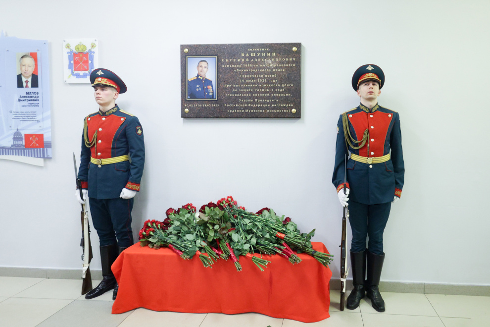 Губернатор Петербурга Александр Беглов и председатель Законодательного Собрания Александр Бельский приняли участие в торжественной церемонии открытия памятной доски первому командиру Ленинградского полка полковнику Евгению Александровичу Вашунину в школе № 16 Василеостровского района, сообщили в пресс-службе Смольного.